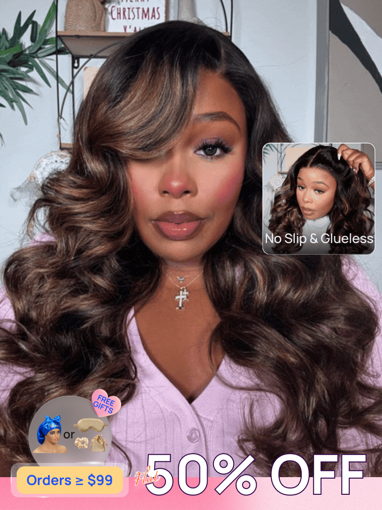 50% OFF | Nadula Flash Sale Brown Highlight Body Wave Wig 7x5 Byebye Knots Lace Closure Human Hair Wig