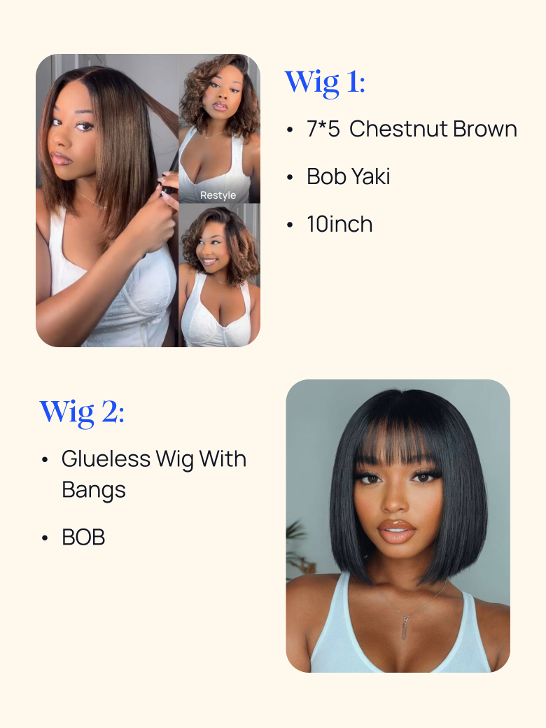 $89=2 Wigs| Nadula 14 Inch 7*5 Byebye Knots Drawstring Wig and 8 Inch Glueless Bob Wig With Bangs