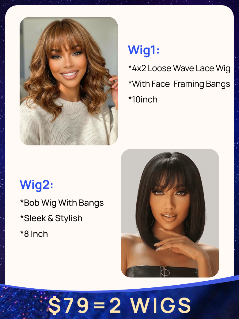 $79=2 Wigs| Nadula 4x2 Lace 10 Inch Light Brown Loose Wave Wig with Bangs and 8 Inch Bob Wig with Bangs