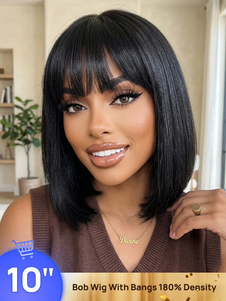 BOGO Free | Nadula 10Inch Bob Wig With Bangs 180% Density Classic Cap