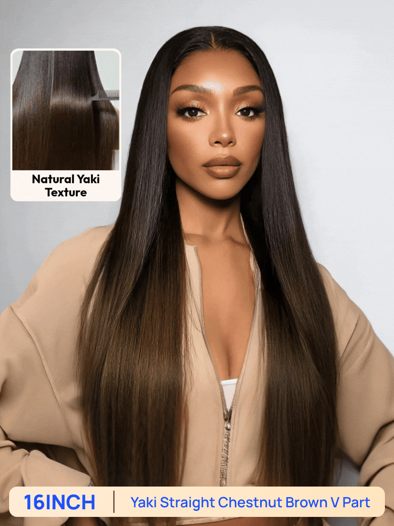 BOGO Free | Nadula 16 Inch Yaki Straight V Part Chestnut Brown Yaki Straight wig