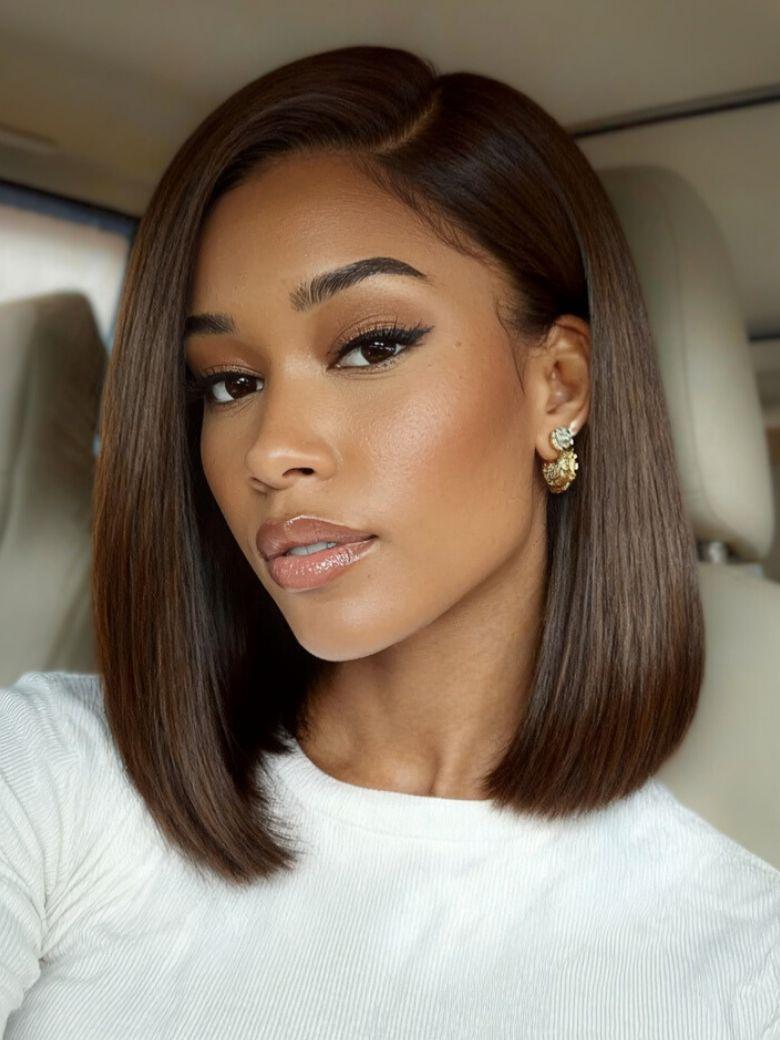 • Nadula 7x5 Dark Chocolate Brown Yaki Straight Side Part Bob Wig Shoulder-Length Wig Put On And Go Glueless Human Hair Wig
