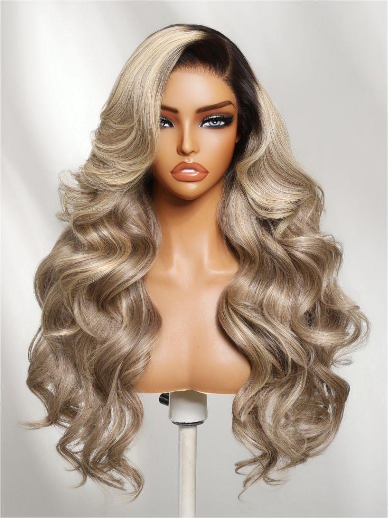 Nadula 13x4 Lace Front Soft Bombshell Body Wave Light Ash Blonde And Beige Blonde Highlights With Dark Roots Side-Part Wig