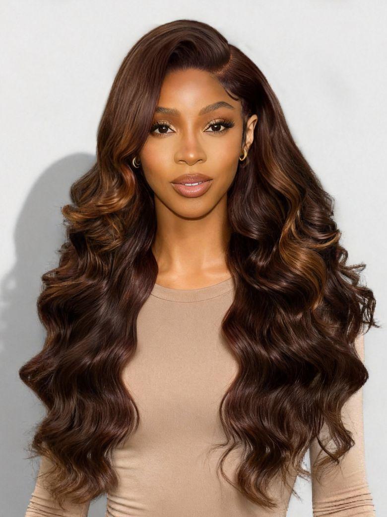 Nadula 13x4 Warm Chestnut Brown Soft Body Wave with Long Face-framing Layers Lace Frontal Invisible Knots Put on and Go Wig