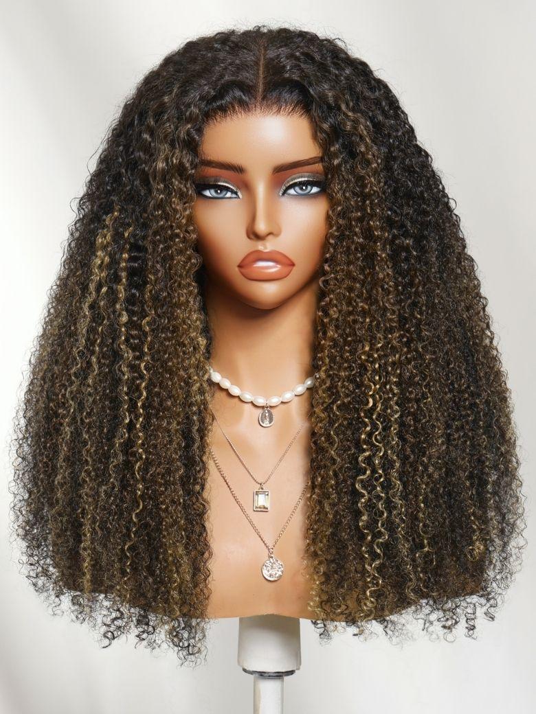 Nadula 7x5 Blonde Highlight Kinky Curly Wigs Brown Ombre No Slip Put On and Go Wig with Drawstring Invisi Knots Glueless Human Hair Wigs