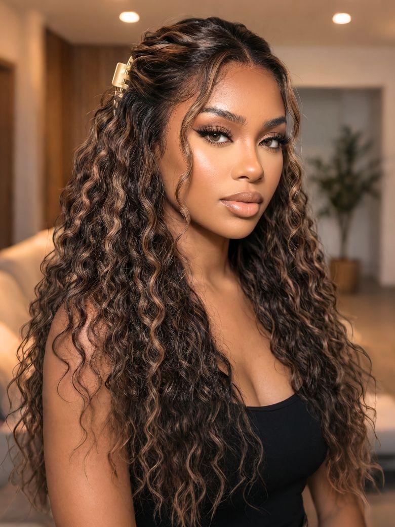 Nadula 7x5 Golden Brown Highlight Wig Water Wave Bye Bye Knots Lace Closure Wig 150% Density