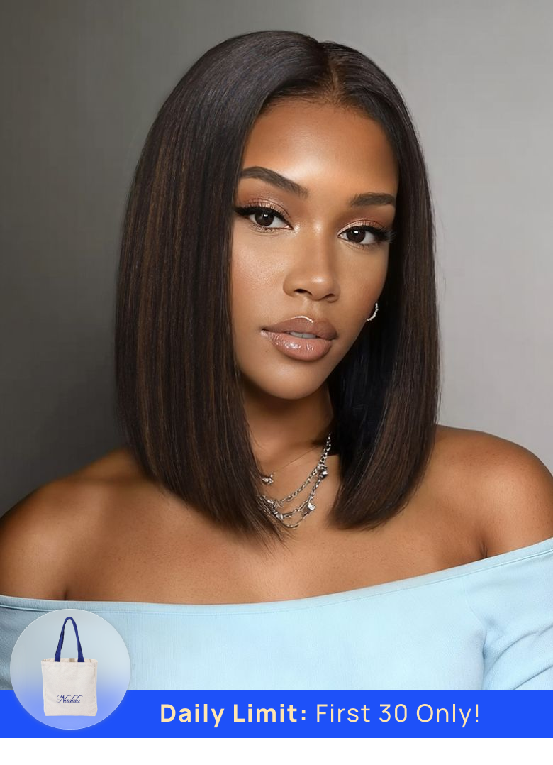 Nadula 7x5 Lace Closure Blunt Cut Yaki Bob Natural Black and Caramel Highlights Bob Wig