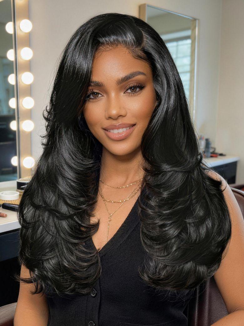 Nadula 7x5 No Slip Wig 90s Blowout Hair Face-framing Feathered Layers Deep Side Part with a Swoop Bang Glueless Wig 200% Density