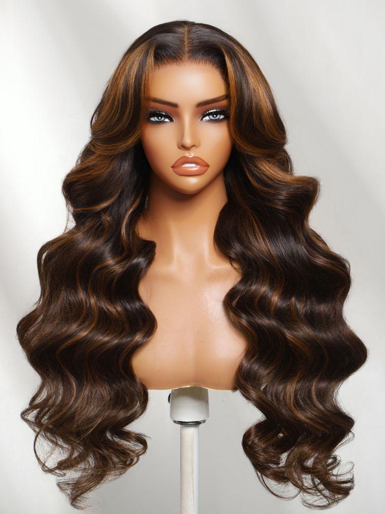 Nadula 7x5 No Slip Wig Dark Brown Wig with Caramel Balayage Long Body Wave Bouncy Blowout Waves Lace Closure Human Hair Wigs