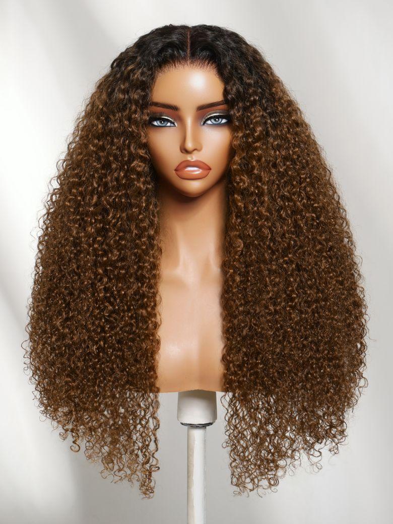 Nadula 7x5 No Slip Wig Natural Curly Hair Warm Caramel Brown Color with Dark Roots Sun-Kissed Fluffy Curly Lace Closure Glueless Wigs