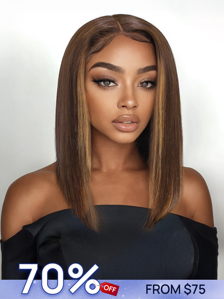 Nadula Flash Sale Mocha Brown Highlight Wig 7x5 Bye Bye Knots Pre-Bleached Bob Wig Chocolate Brown with Caramel Highlights