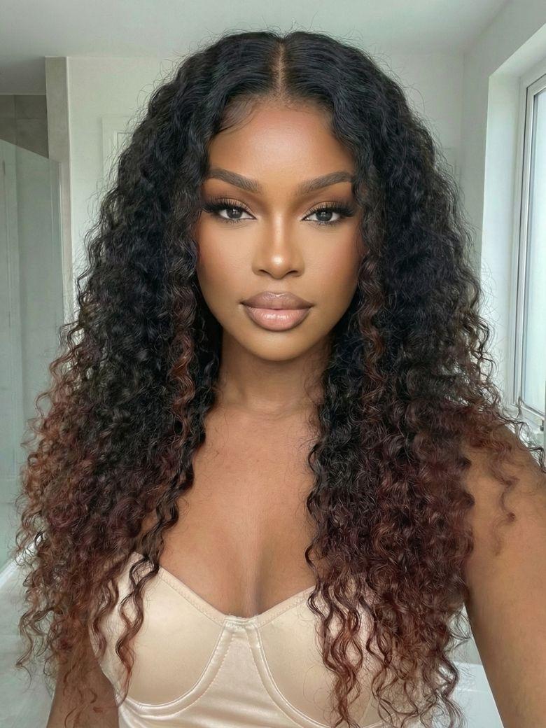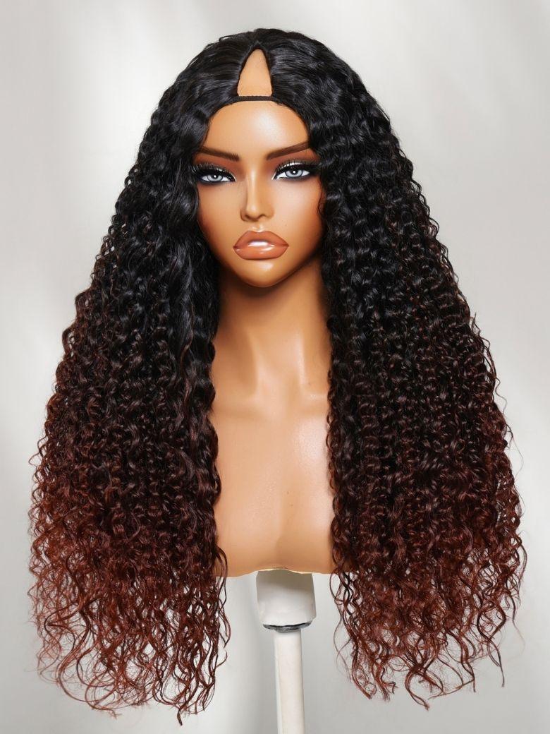 Nadula Natural Yaki Texture Water Curly Hair Ombre Copper Auburn V Part Wigs Lightweight Glueless Human Hair